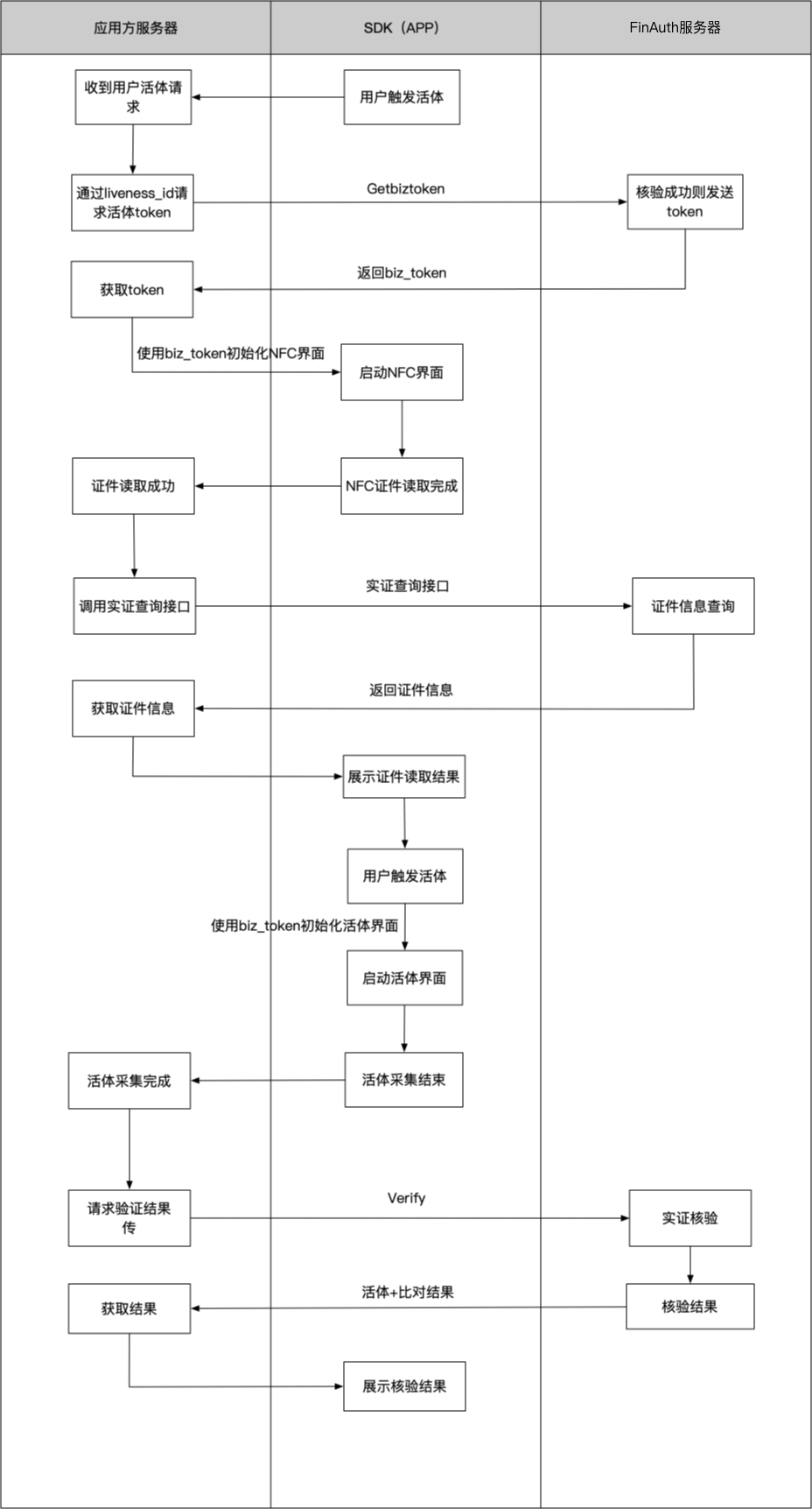 3、通过biz_token初始化SDK实证读取页面,用户完成NFC读取身份证流程后调用实证查询接口获取查询结果,APP可在页面上展示读取信息; 随后继续通过biz_token初始化SDK活体页面进行活体验证流程,活体与实证读取可自定义先后顺序; 用户每次操作完成后SDK会告知APP;请下载SDK并参考集成文档 |